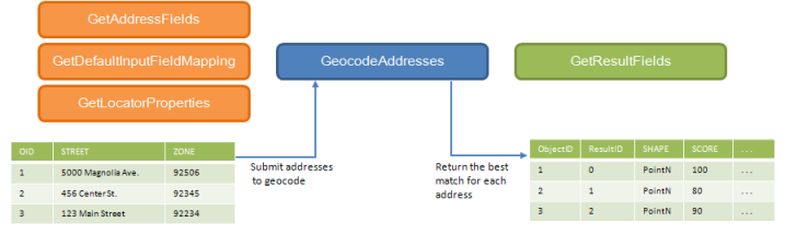 A RecordSet containing the best match for each input address based on the highest score. The names of the fields in the RecordSet are defined by the names of the fields returned by the GetResultFields method. If a geocode service finds two or more matches that have the same highest match score, you can specify whether or not to match an address arbitrarily using the MatchIfScoresTie property of the locator. See the PropMods discussion below for more information on modifying geocode service (locator) properties.