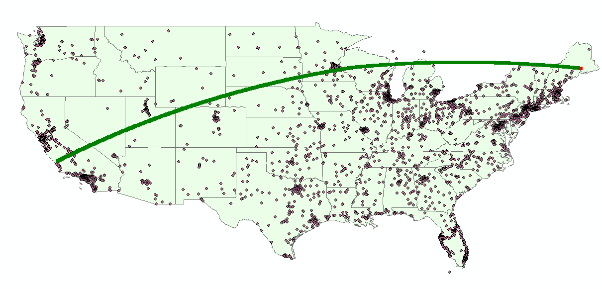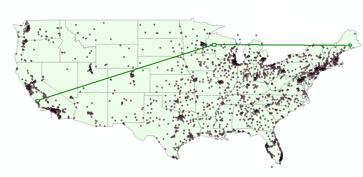 The figure below illustrates the this operation applied to a polyline with 3 vertices, with a max output segment length of 10,000 meters.