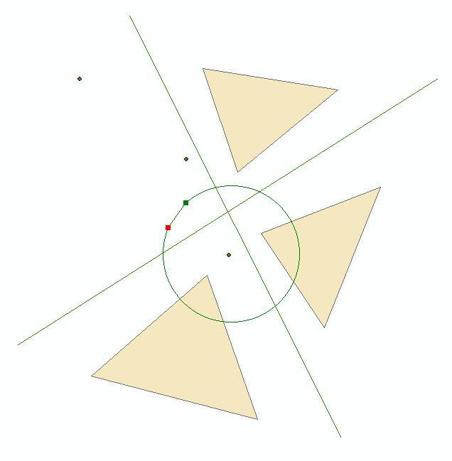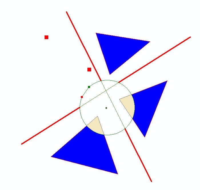 The figure below shows an example of the difference operation. The geometry array contains all geometries shown with the exception of the central circular polygon. The output array contains the modified geometries shown in the right part of the figure. Note that one of the output points will be ”r;empty” because the corresponding input is inside the circular polygon.