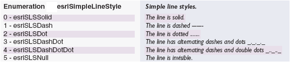 Style property determines which style of the line is used. It can be set to one of six basic line patterns by using the esriSimpleLineSyle constants.