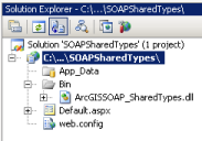 Since the file extension of the text file is ".bat", you can type the file name "sharedsoaptypes.bat" on the command line to execute both commands. Upon completion, you should have a file named ArcGISSOAP_SharedTypes.dll in the temp directory you created eariler in this section. This assembly will be referenced by the project created in the next section.